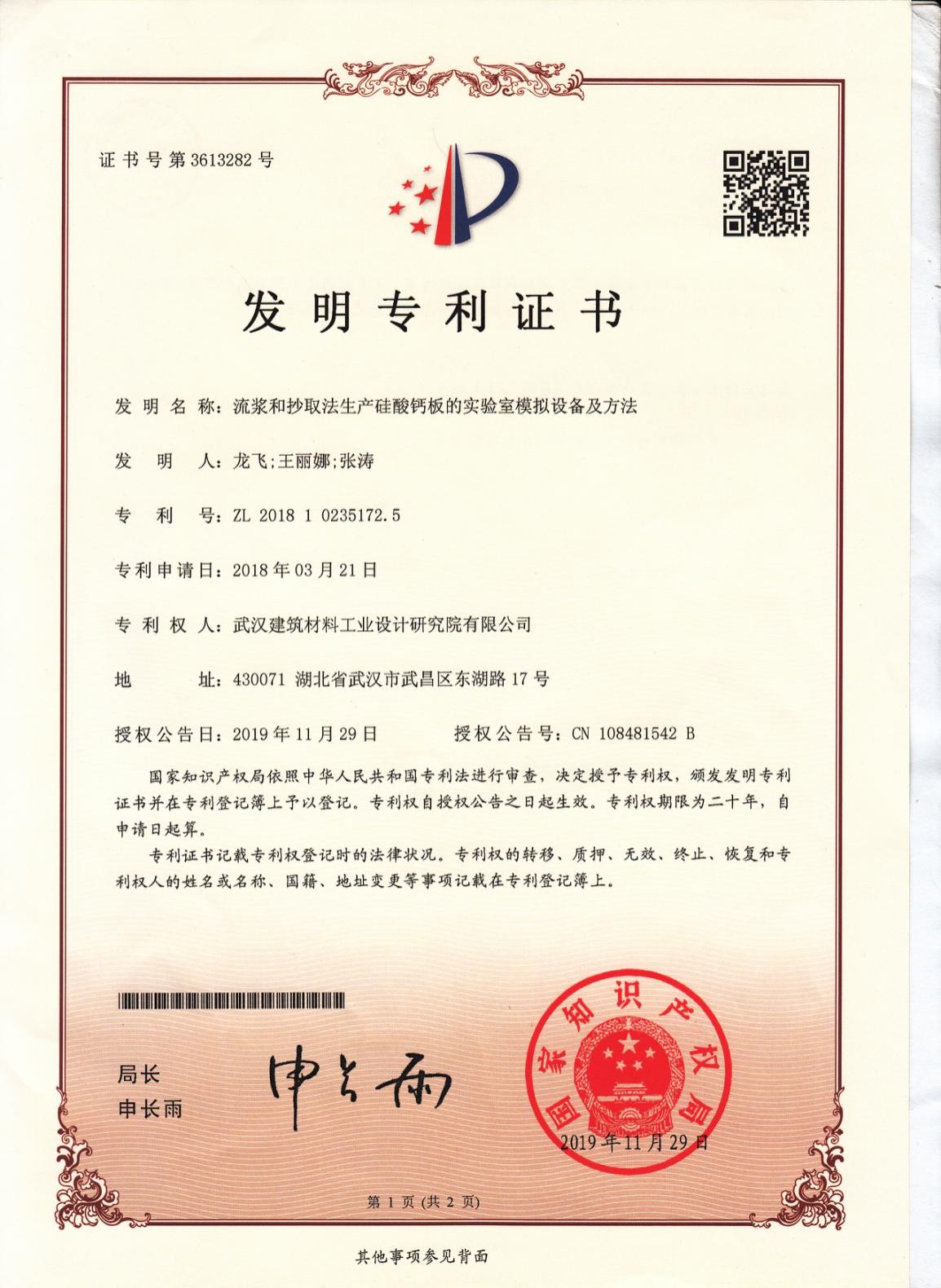 專利證書(流漿和抄取法生產(chǎn)硅酸鈣板的實(shí)驗(yàn)室模擬設(shè)備及方法)