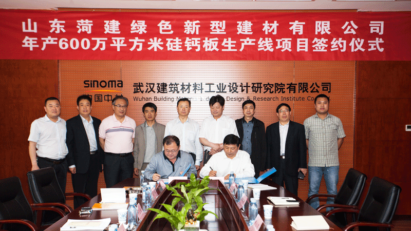 2015年4月25日,武漢院有限公司同山東菏澤綠色新型建材有限公司就硅鈣板生產(chǎn)線項(xiàng)目簽訂合作協(xié)議。武漢院有限公司董事長(zhǎng)姚元君,副總經(jīng)理郭超,楊順德出席簽約儀式。