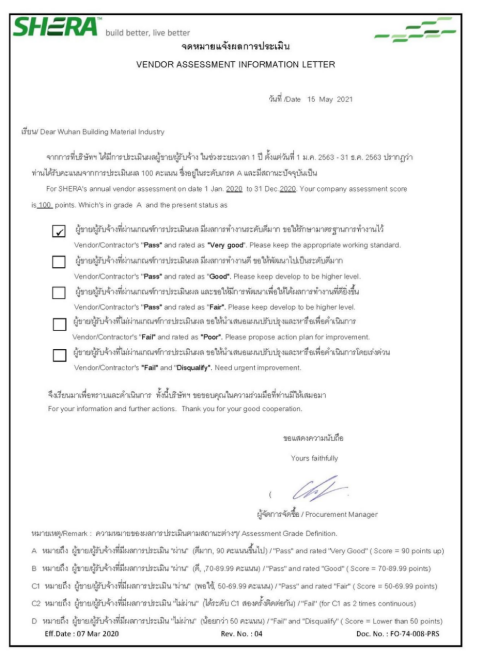 中材節(jié)能股份有限公司(以下簡(jiǎn)稱(chēng)“中材節(jié)能”)所屬武漢建筑材料工業(yè)設(shè)計(jì)研究院有限公司(以下簡(jiǎn)稱(chēng)“武漢建材院”)榮獲泰國(guó)瑪哈攀(Shera)集團(tuán)2020年度供應(yīng)商年度(2020年1月至12月)A級(jí)滿(mǎn)分(100分)供應(yīng)商,得到了瑪哈攀最高等級(jí)的評(píng)定。