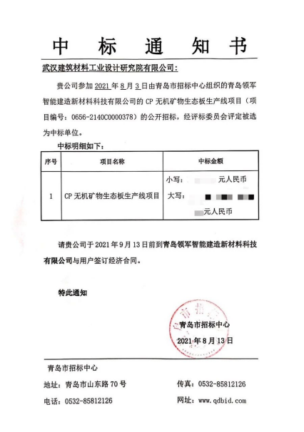 在武漢建材院新一屆領(lǐng)導(dǎo)班子的帶領(lǐng)下,新材事業(yè)部團(tuán)隊(duì)經(jīng)過艱苦努力,成功中標(biāo)青島領(lǐng)軍智能建造新材料科技有限公司平度綠色新型建材產(chǎn)業(yè)園年產(chǎn)500萬平方纖維水泥板生產(chǎn)線EPC總承包建設(shè)項(xiàng)目。