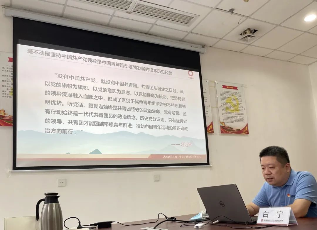 為持續(xù)深入貫徹落實習(xí)近平總書記關(guān)于共青團(tuán)和青年工作重要講話和指示批示精神,團(tuán)結(jié)動員廣大青年在思想洗禮、在實踐鍛造中不斷增強做中國人的志氣、骨氣、底氣,始終聽黨話、跟黨走,在實現(xiàn)中華民族偉大復(fù)興的賽道上踔厲奮發(fā)、勇毅前行,9月13日下午,武漢建筑材料工業(yè)設(shè)計研究院有限公司團(tuán)委按照《中國建材集團(tuán)青年精神素養(yǎng)提升工程工作方案》具體部署要求,開展“黨委書記指導(dǎo)學(xué)”活動,由黨委書記、副總經(jīng)理白寧、團(tuán)委書記崔鵬為青年團(tuán)員講授主題團(tuán)課。