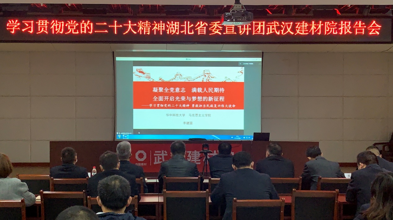 11月23日上午,公司開展學習貫徹黨的二十大精神湖北省委宣講團武漢建材院報告會,由省委宣講團成員、華中科技大學馬克思主義學院副院長李建國教授就黨的二十大精神進行宣講。